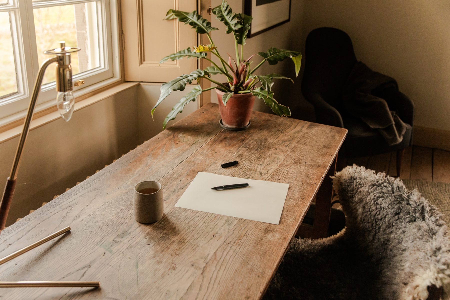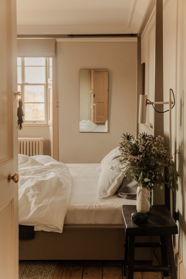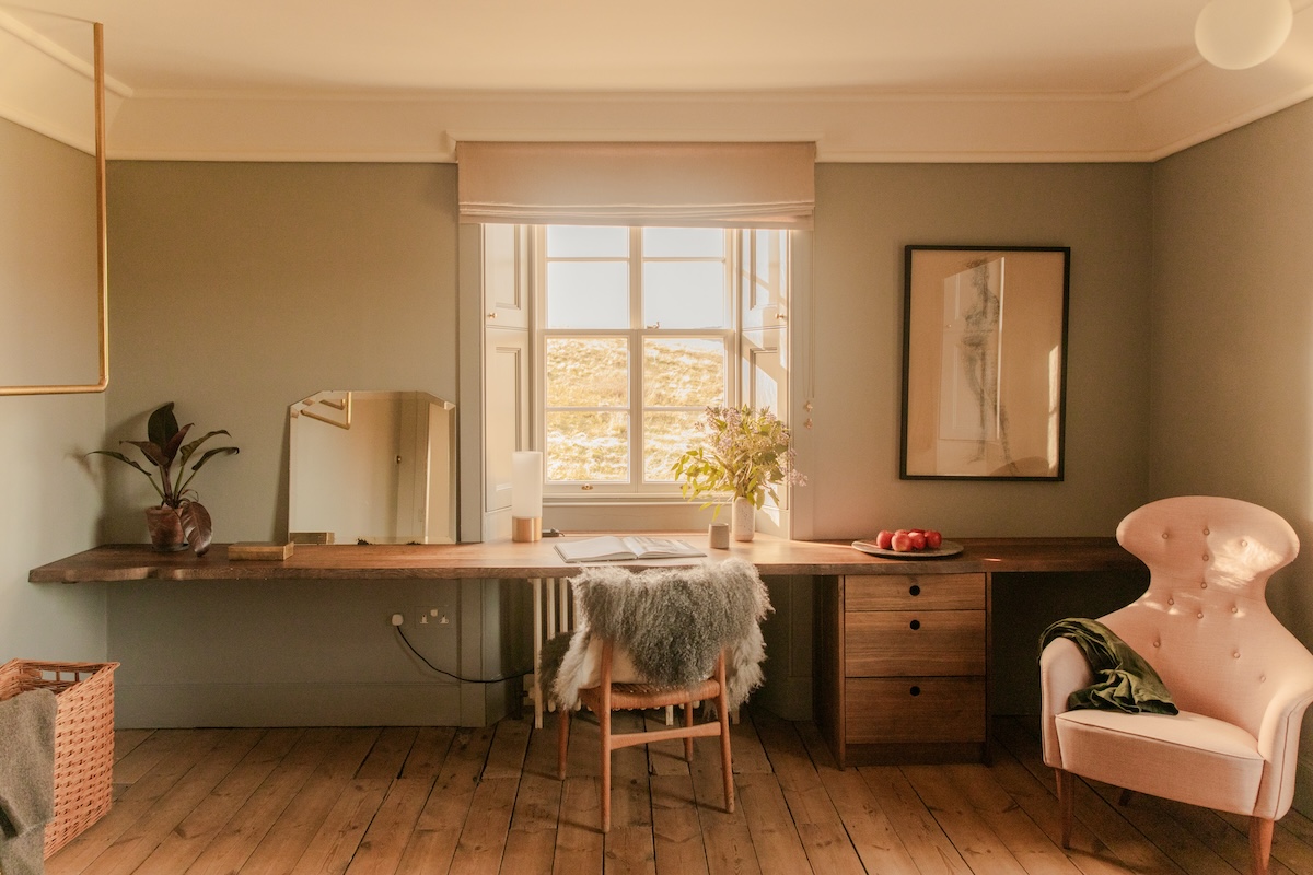 Alder is the largest bedroom at Killiehuntly Farmhouse. Comfy seats and a large writing desk overlooking the Cairngorm mountains make for a cosy corner of the house to call your own.rnrnDefined by a large four poster bed and framed by two achingly peaceful views of the surrounding estate, Alder is a place to close the door on the world outside and find calm. Alder also has an en suite shower room.